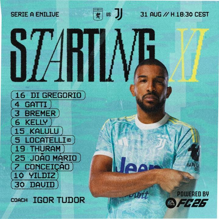 尤文首发:16-迪格雷戈里奥、3-布雷默、4-加蒂、6-凯利、15-卡卢卢、25-马里奥、5-洛卡特利、19-凯夫伦-图拉姆、7-小孔塞桑、10-伊尔迪兹、30-乔纳斯-戴维
